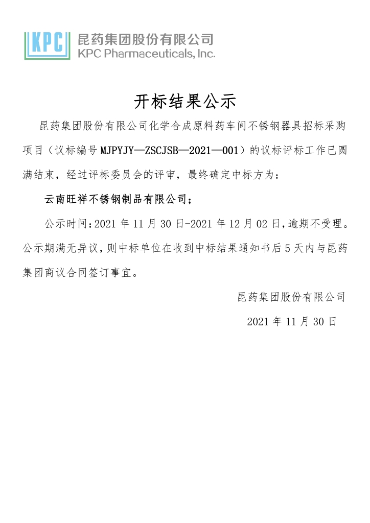 <span class="bdsharebuttonbox" data-tag="share_3" data-sharetitle="开标结果公示(化学合成原料药车间不锈钢器具招标采购项目)"><a href="#" class="bds_sqq" data-cmd="sqq" title="分享到QQ好友"></a><a href="#" class="bds_weixin" data-cmd="weixin" title="分享到微信"></a><a href="#" class="bds_qzone" data-cmd="qzone" title="分享到QQ空间"></a><a href="#" class="bds_tsina" data-cmd="tsina" title="分享到新浪微博"></a><a href="#" class="bds_more" data-cmd="more"></a></span> 开标结果公示(化学合成原料药车间不锈钢器具招标采购项目) <span><i class="ico-1"></i>2021-11-30</span><span class="views"><i class="ico-1"></i><b id="viewCountId"></b></span><span id="switcher"> <a href="javascript:void(0)" id="big"><i class="ico-1"></i></a> <a href="javascript:void(0)"><i class="ico-1"></i></a> <a href="javascript:void(0)" id="small"><i class="ico-1"></i></a> </span> 上一条开标结果公示【昆中药一车间超微粉碎机设备采购项目(第二次)】 下一条中标结果公示(凯时尊龙集团马金铺原料药分厂提取一车间技术改造项目消防工程)